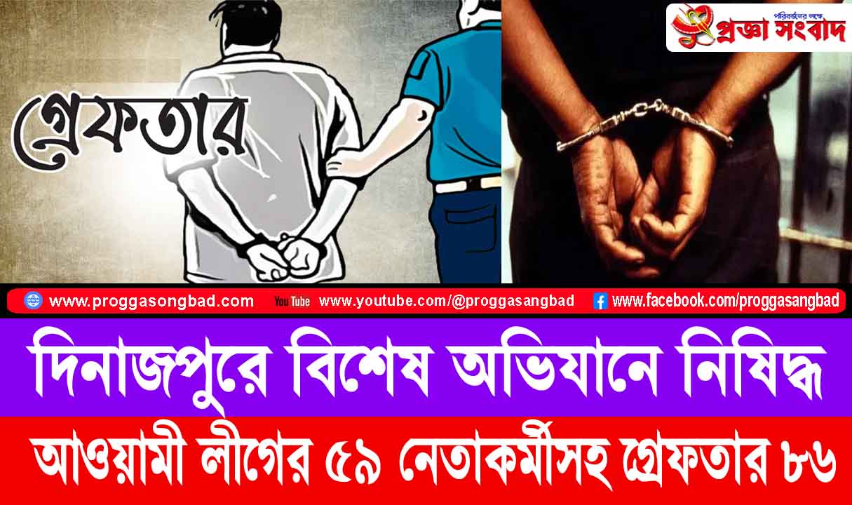দিনাজপুরে বিশেষ অভিযানে নিষিদ্ধ ঘোষিত আওয়ামী লীগের ৫৯ নেতাকর্মীসহ মোট ৮৬ জনকে গ্রেফতার করেছে পুলিশ। মঙ্গলবার (১১ নভেম্বর) বিকেলে জেলা পুলিশ সুপার (এসপি) কার্যালয়ের মিডিয়া সেল থেকে পাঠানো এক প্রেস বিজ্ঞপ্তিতে এ তথ্য জানানো হয়।