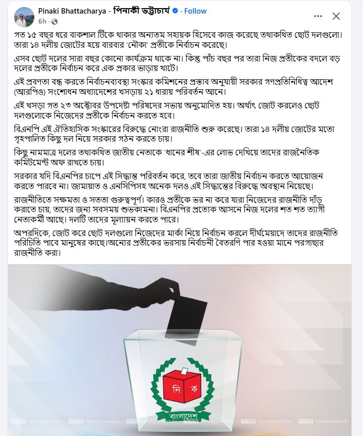বিএনপি এই ঐতিহাসিক সংস্কারের বিরুদ্ধে নোংরা রাজনীতি শুরু করেছে। তারা ১৪ দলীয় জোটের মতো গৃহপালিত কিছু দল নিয়ে সরকার গঠন করতে চায়।