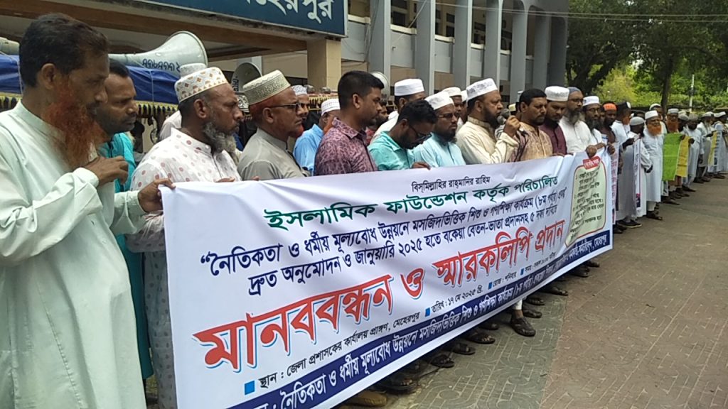 ধর্ম বিষয়ক মন্ত্রণালয়ের আওতাধীন ইসলামিক ফাউন্ডেশন কর্তৃক পরিচালিত নৈতিকতা ও ধর্মীয় মূল্যবোধ উন্নয়নে মসজিদভিত্তিক শিশু ও গণশিক্ষা কার্যক্রম (৮ম পর্যায়) প্রকল্প দ্রুত অনুমোদন ও জানুয়ারি ২০২৫ হতে বকেয়া বেতন-ভাতা প্রদানসহ ৫ দফা দাবিতে মেহেরপুরে মানববন্ধন ও স্মারকলিপি প্রদান কর্মসূচী পালন করা হয়েছে। শনিবার সকাল ১১টার দিকে জেলা প্রশাসকের কার্যালয়ের সামনে নৈতিকতা ও ধর্মীয় মূল্যবোধ উন্নয়নে মসজিদভিত্তিক শিশু ও গণশিক্ষা কার্যক্রম (৮ম পর্যায়) প্রকল্পের শিক্ষক, কেয়ারটেকার, কর্মকর্তা-কর্মচারীবৃন্দের আয়োজনে এই এই কর্মসূচি পালন করা হয়।
